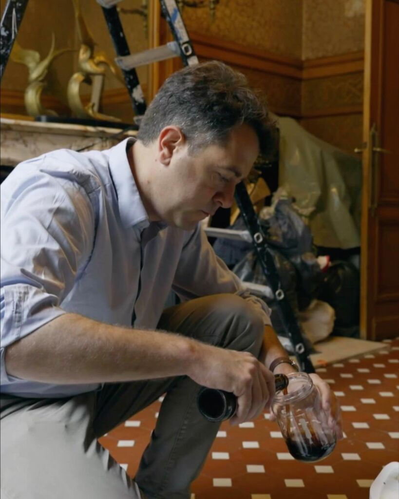 Pour les finitions les plus précises, le propriétaire a fait appel à Hugues Losfeld, un maître artisan d'art spécialisé dans les décors peints. Il a déjà restauré un autre joyau de l'Art Nouveau, la Villa Majorelle à Nancy. Pour créer des faux bois et donner l'illusion de l'ancien, il utilise un mélange singulier à base de bière pour fixer les pigments.