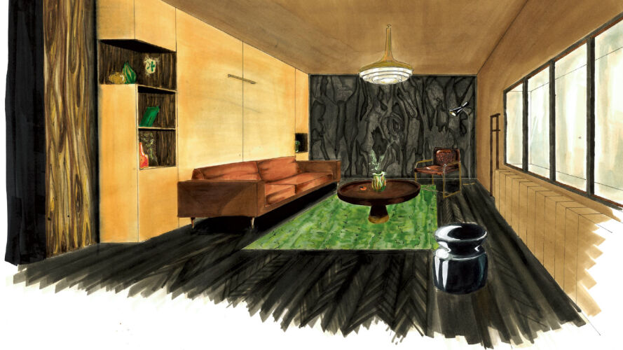 Croquis et mise en couleur réalisés par notre élève Décorateur d'intérieur dans le cadre du projet sur le chalet à la montagne. Mise en couleur faite au feutre.